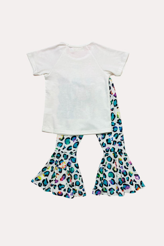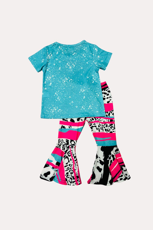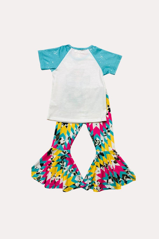 X0777-8 Light blue cow face short sleeve 2pc western girls sets
