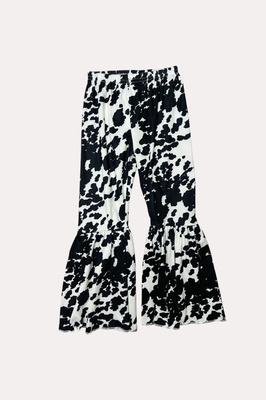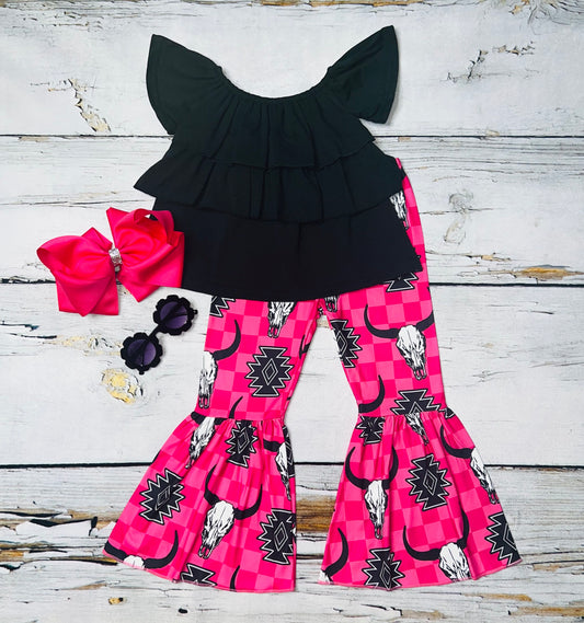 Sold outBlack ruffle top w/hot pink checkers & bull skulls print bell bottoms 2pc set