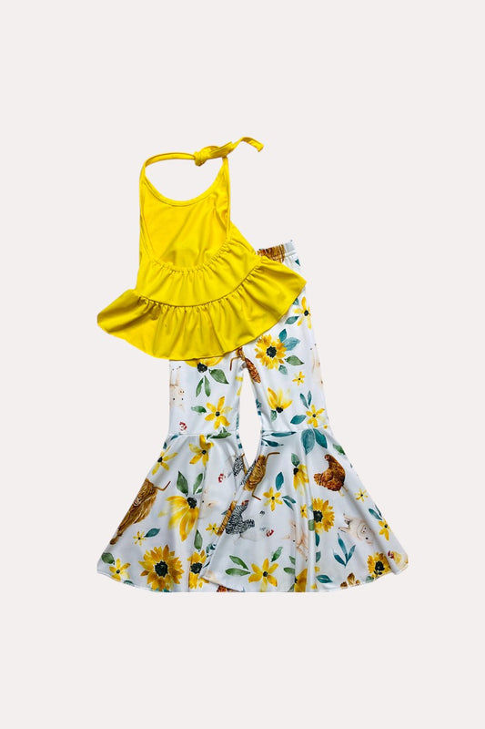 D1224-13 Yellow halter top w/floral bell bottoms 3pc set