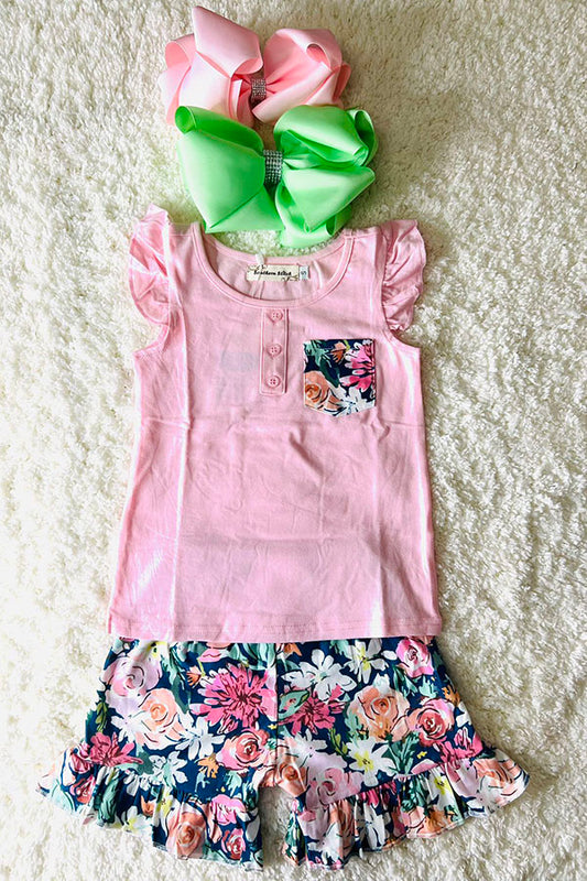SaleSummer pink top floral shorts girls clothing set X0666-31
