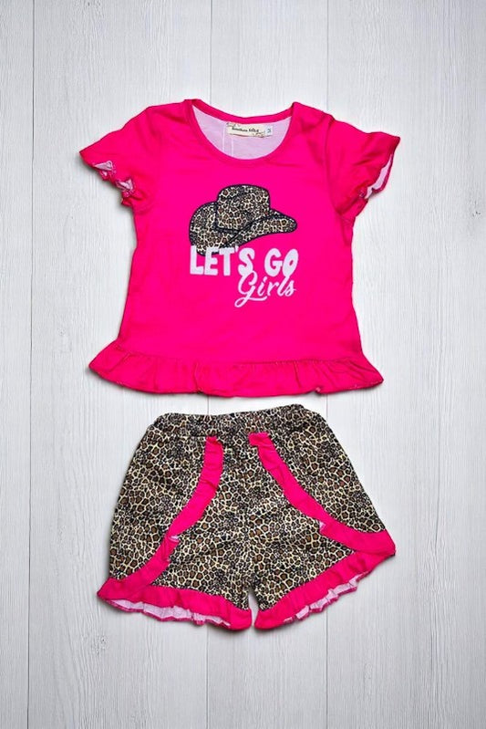 Sale"Let's go girls" cowgirls hats top & leopard ruffle shorts 2pc girls sets X0333-14