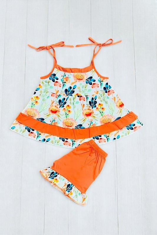 Orange floral print top & ruffle shorts 2pc girls set X0666-2