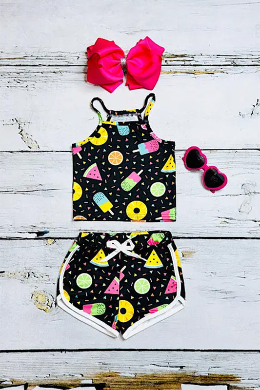 Multicolor fruits & popsicles sleeveles top & shorts girls set D2404