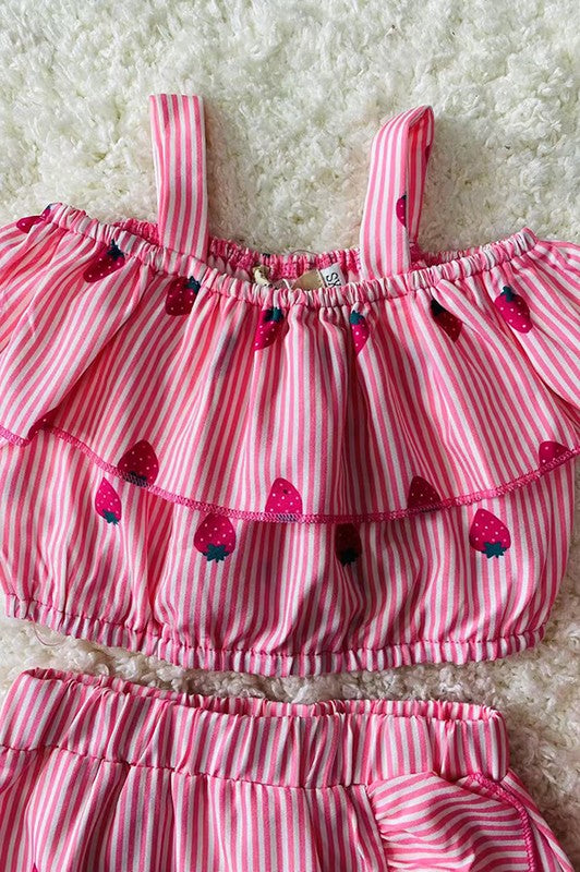 X04024 Pink strape & strawberry printed top & skirt 2pc girls sets