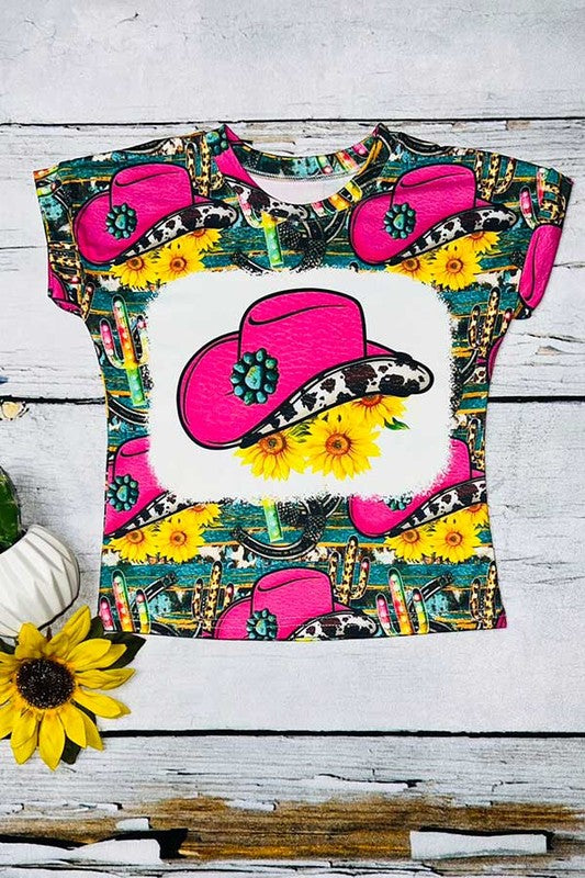 Western girls t-shirt vendors Pink cowboy hat, cactus, & sunflowers short sleeve top D0913-17