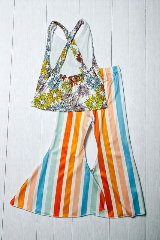 Multicolor daisy's top w/stripped bell bottoms 2pc girls set D1215-38
