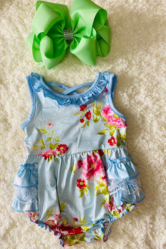 Wholesale Light blue floral ruffle sleeveless baby romper DLH2518