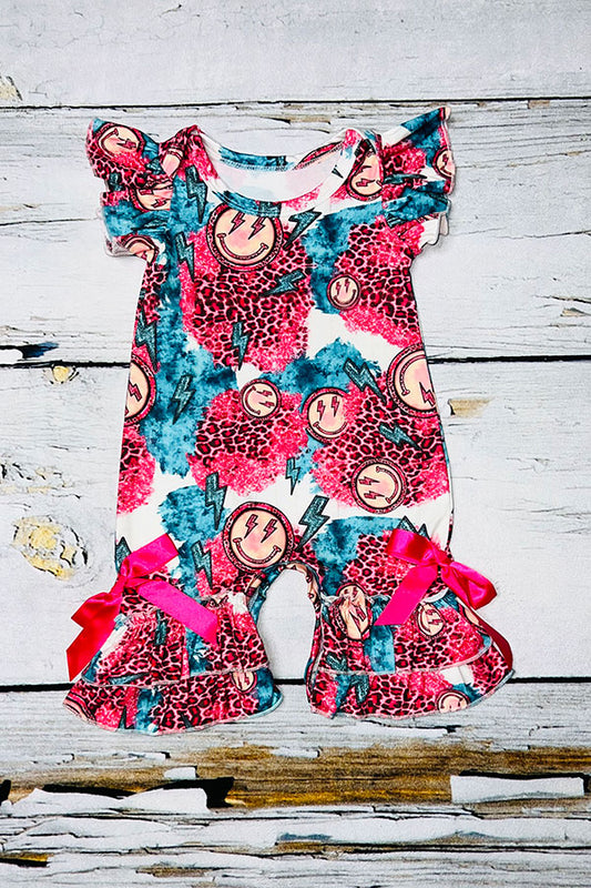 Smiley face w/hot pink cheetah print ruffle baby romper D1124-11
