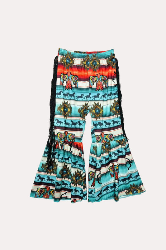 1126WY Aztec print bell bottoms girls pant w/fringe