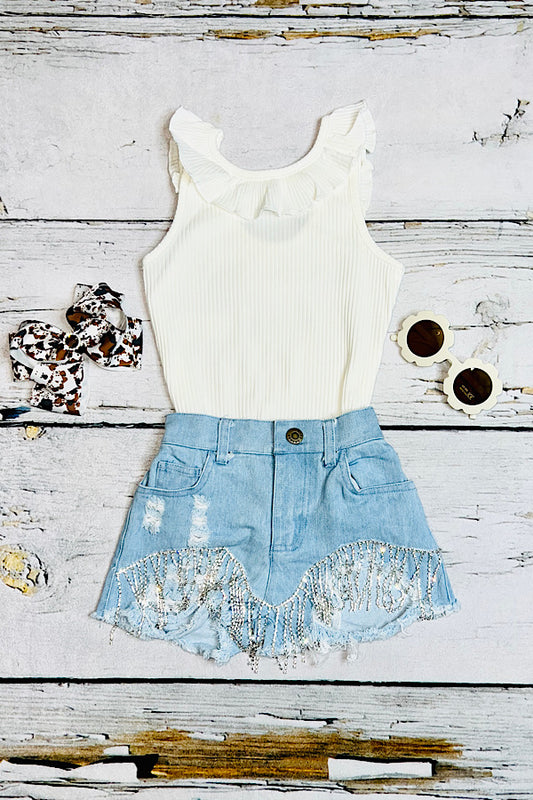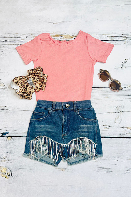 Dark wash denim girls shorts w/rhinestone tassels DLLH2393