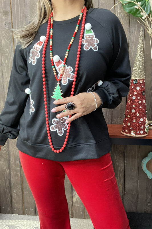 SaleSanta Claus sequin patch black long sleeve raglan women blouse with side split XCH15219
