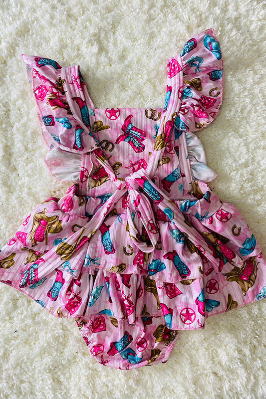 Pink western print ruffle ribbed knitted fabric baby romper w/matching headband D1215-27