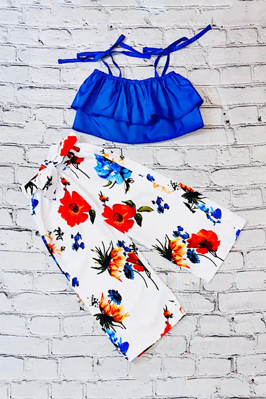SaleShop kids boutique clothes Royal blue ruffle top w/floral flare pants 3pc girls sets D2506