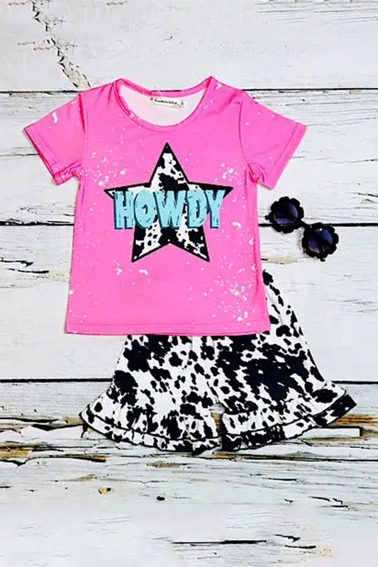 Girls clothing wholesale "HOWDY" pink w/cow print short sleeve 2pc set X0777-9H