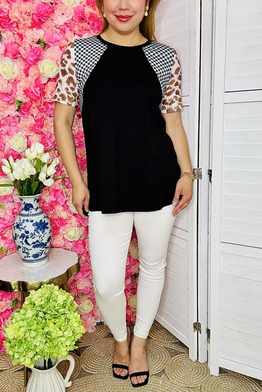 Southern women's clothing suppliers checkered & leopard & black raglan short sleeve GJQ10064