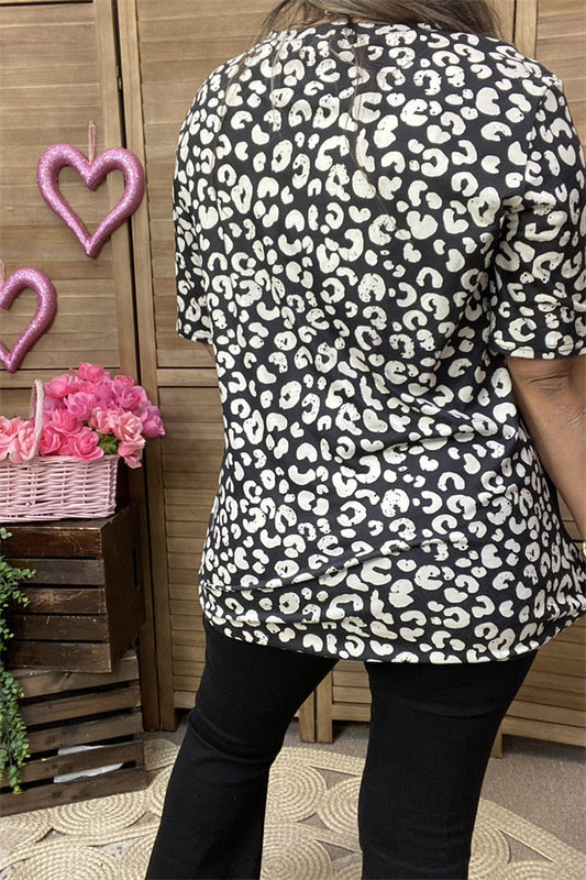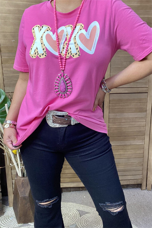 DLH10438 "XX" leopard&heart printed short sleeve pink women tops