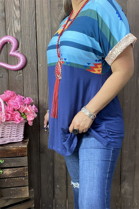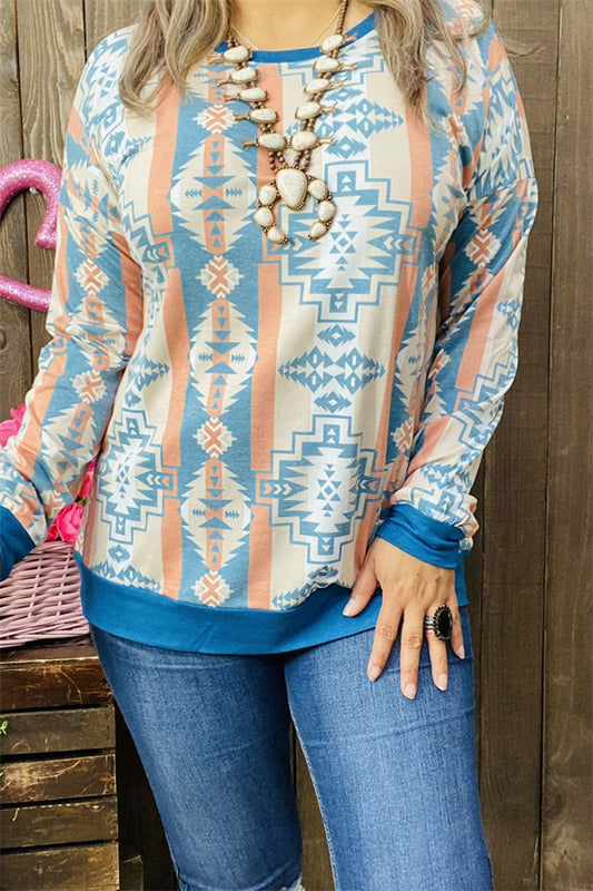 GJQ10223 Solid blue neckline/cuff/hem &Aztec multi color printed long sleeve women top(AS5)