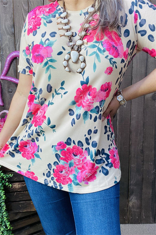 SaleGJQ14377 Pink Floral leopard printed beige fabric short sleeve women tops
