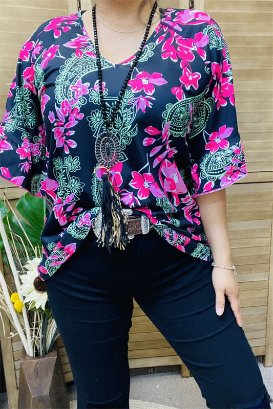SaleGJQ15834 Mint paisley&pink floral printed short sleeve w/ruffle women black tops