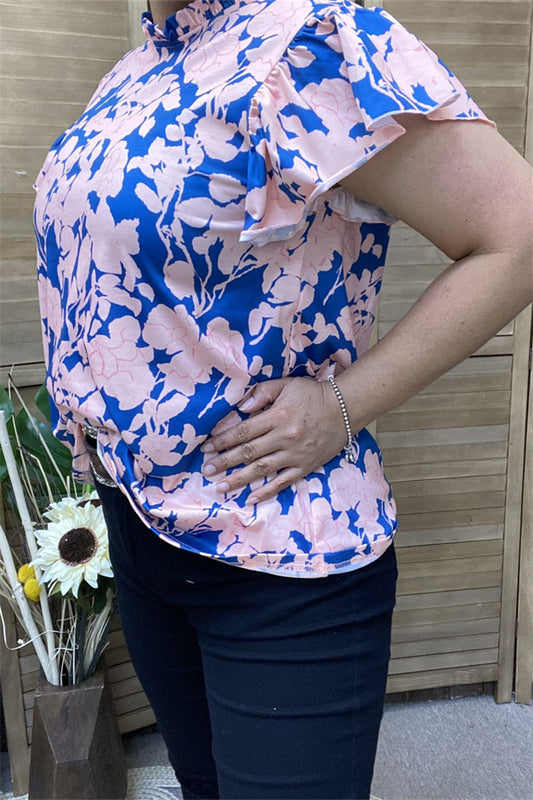 SaleXCH15808 Teal/pink color printed ruffle short sleeve women tops w/ruffle round neckline