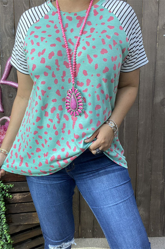 GJQ9593 Mint/pink leopard printed w/striped short sleeves women top