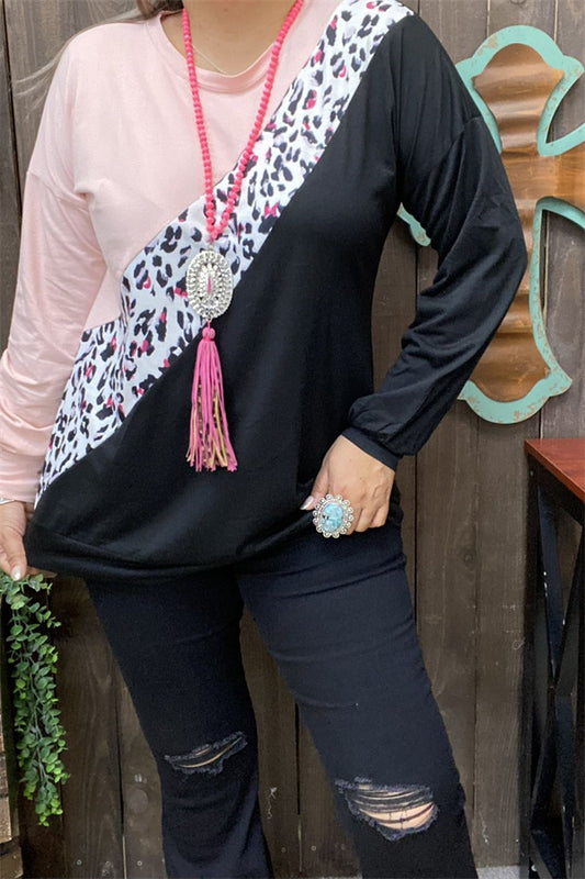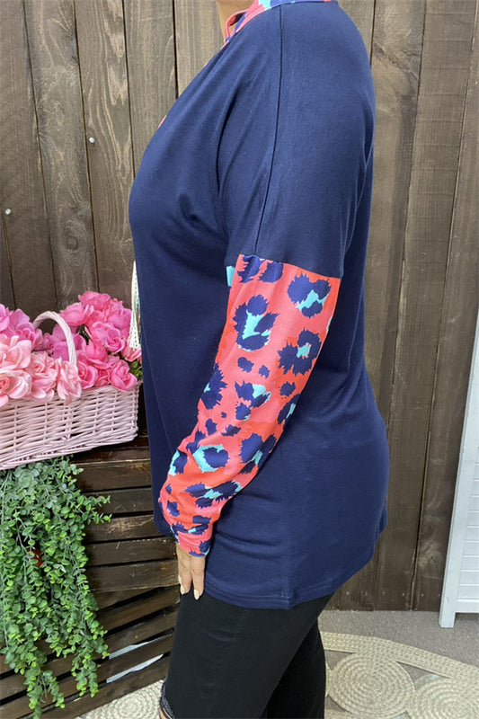 BQ10505 Navy blue cold shoulder top w/leopard printed long sleeves