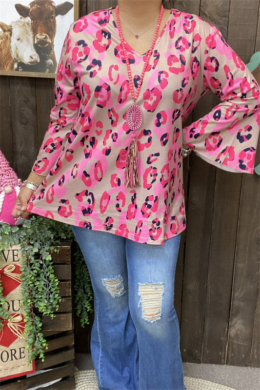 SaleGJQ15750 Pink/fuchsia Leopard multi color printed 3/4 bell sleeve women tops