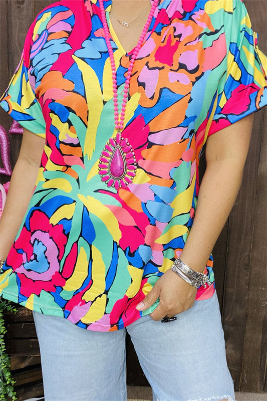 SaleGJQ15636 Teal/mint/orange multi color printed short sleeve women top w/V-neckline