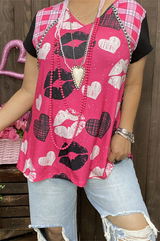 XCH14675 Heart&lips/checked multi color printed webbing trim black short sleeve women top