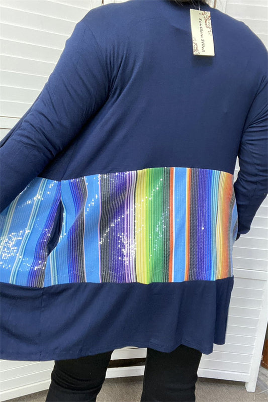 FW8050-2 Wholesale Navy blue/serape sequin color block long sleeve women cardigan w/pockets CS11