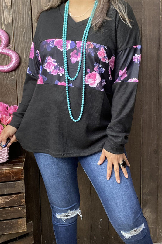 SaleBQ15683 Floral multi color printed black solid color knitted fabric long sleeve women tops