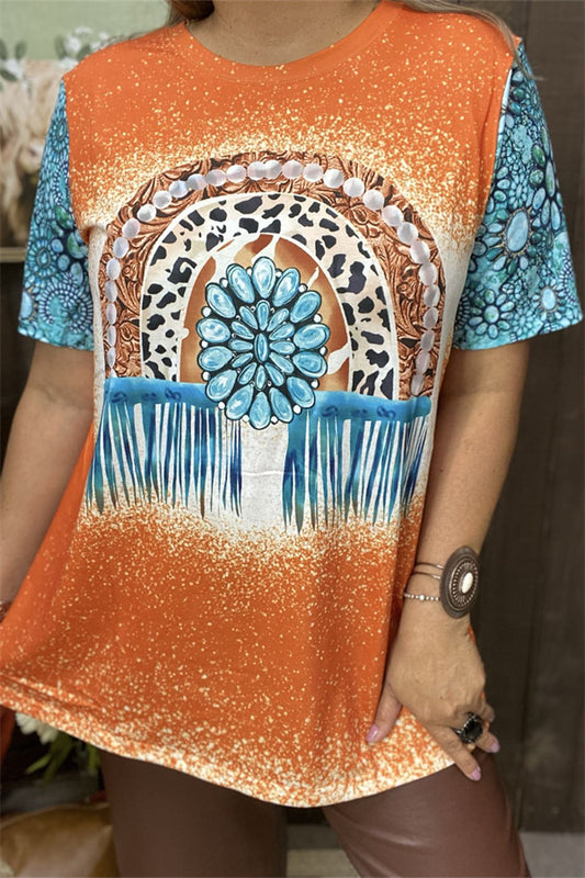 SaleGJQ14902 Orange Aztec prints & leopard short sleeve women top