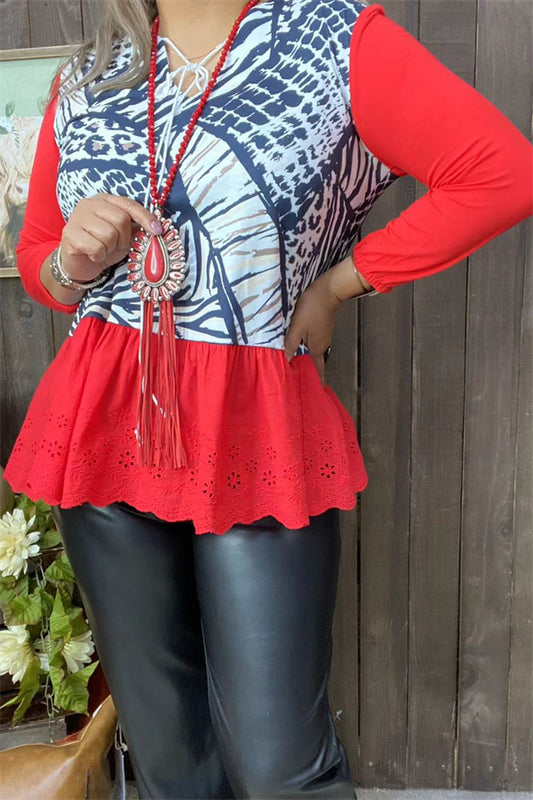 SaleGJQ15031 Black striped Red block printed 3/4 sleeve ruffle hem women tops