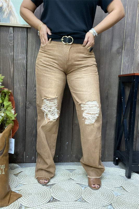 SaleS013 Scratch on the knee tan jean long straight women pants
