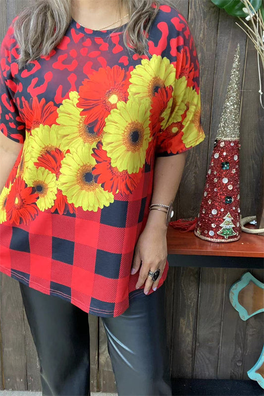 XCH13826 Plaid daisy flower red/yellow/black printed short sleeve women tops