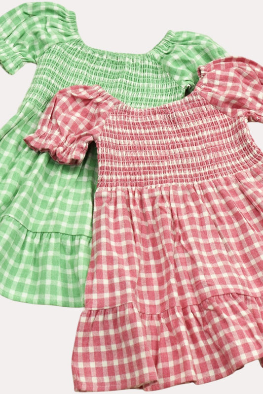X03017 Pink plaid gathered & ruffles short sleeve cotton girls dress