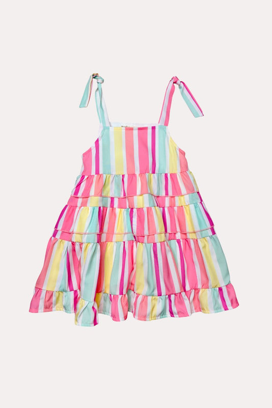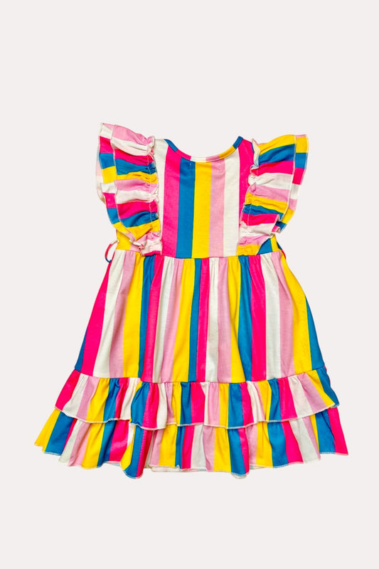 X03008 Multi color striped ruffle sleeve girls dress w/tied belt
