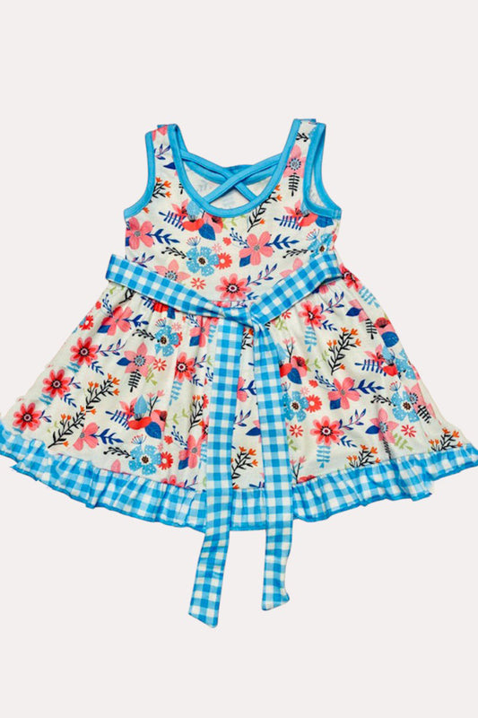 XCH0555-14 Summer floral printed & blue checkered girls dress w/side belt