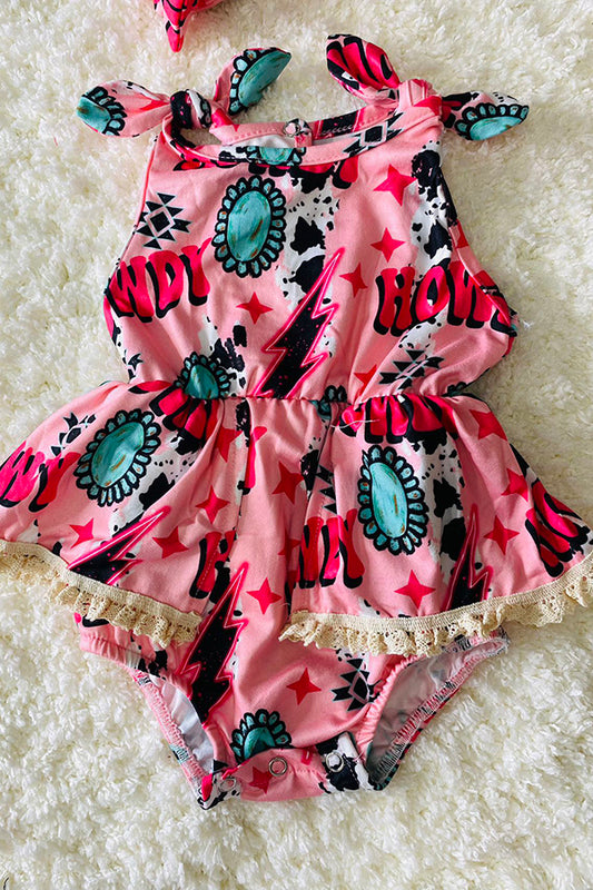 Pink "HOWDY" jewels & cow print baby lace romper w/matching headband DLH2434