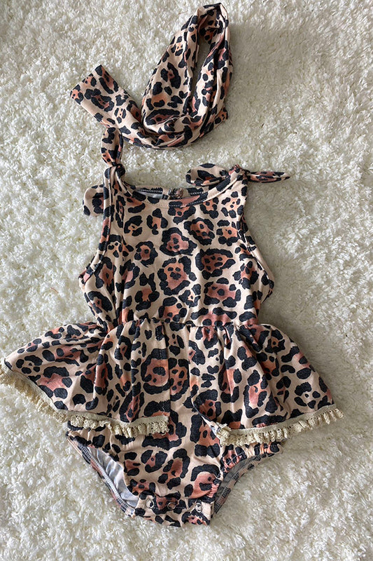 Leopard print & lace baby romper w/matching headband DLH2405