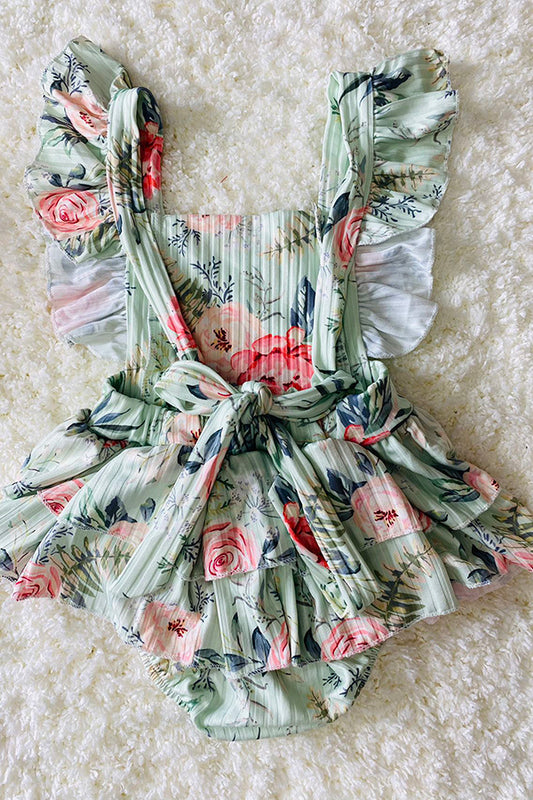 DLH1215-28 Aqua floral print ruffle baby romper w/matching headband