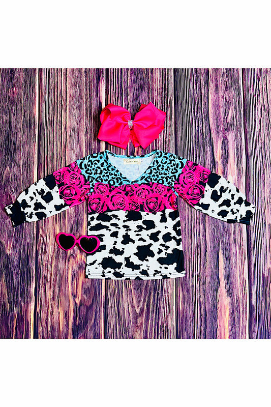 Cow, hot pink roses, & turquoise animal print v-neck top XCH0011-1H