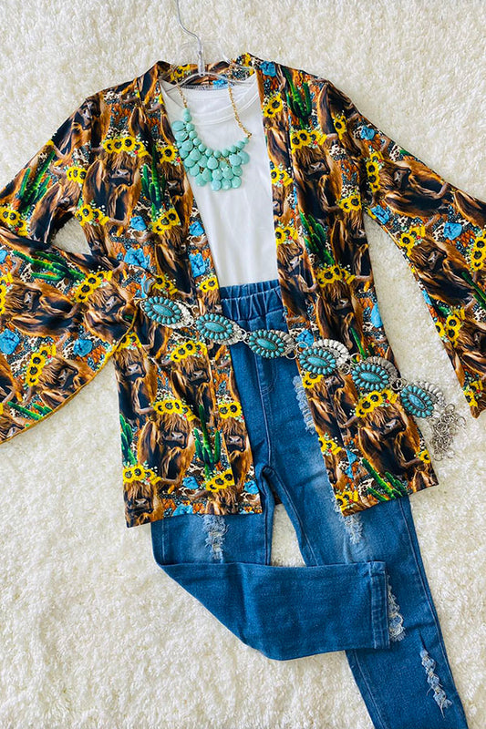 Multicolor bull w/sunflowers & cactus bell sleeve cardigan DLH0923-28