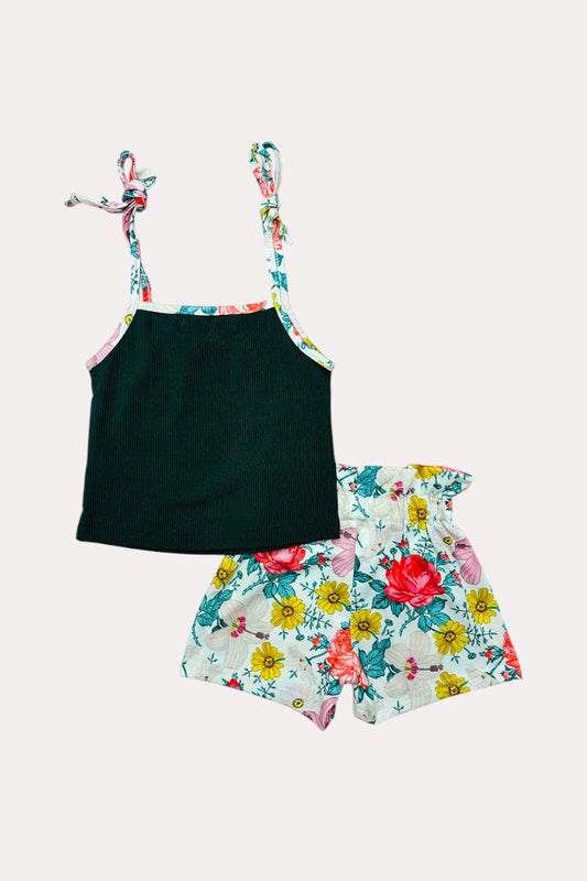 X0666-26 Floral spaghetti strap green top & floral printed shorts 2pc girls sets