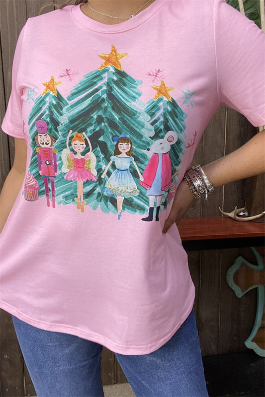 SaleXCH15752 Dancing girls w/stars&trees printed baby pink short sleeve women tops