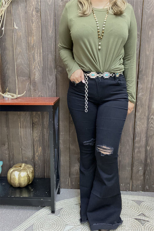 SaleS012 Scratch broken on knee long&bell bottom black women jean pants