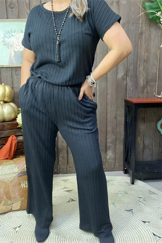 SaleXCH15710-1 Black 2pcs women set knitted fabric short sleeve top & pant