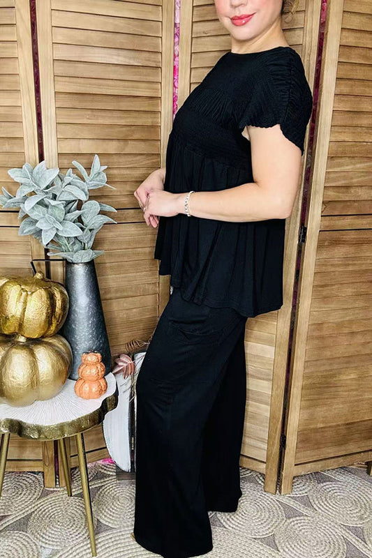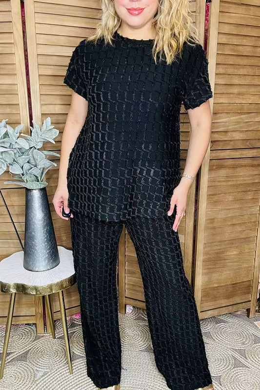 Black textured short sleeve top & wide leg pant 2pc women sets XCH16518