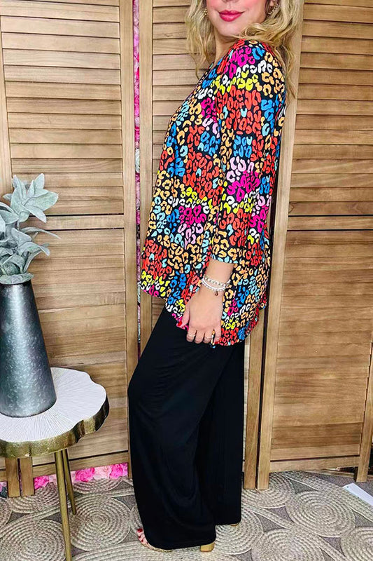 SaleLeopard printed 3/4 sleeve top & black pant 2pcs women sets GJQ15718