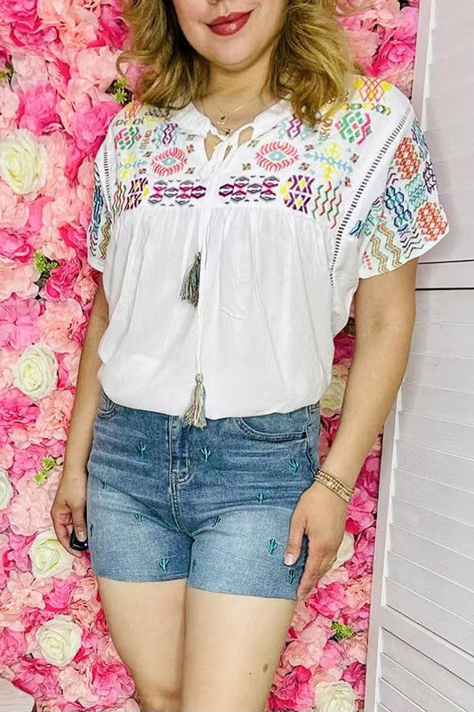 Women's shorts wholesale Blue denim shorts w/aqua cactus embroidery J527